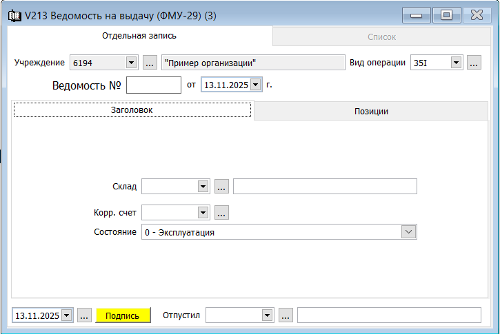Ведомость на выдачу (ФМУ-29) предназначен для отпуска спецодежды, инвентаря, малоценки со склада в эксплуатацию, и отнесения их на счета забалансового учета.