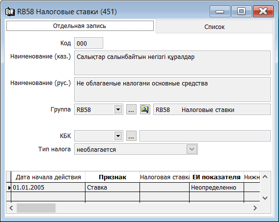Справочник содержит налоговые ставки согласно Налогового Кодекса Республики Казахстан. Используется при автоматическом начислении сумм налога на транспортные средства, земельного налога и налога на имущество.