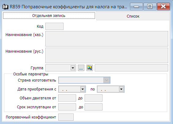 Справочник предназначен для хранения информации по поправочным коэффициентам применяемым при расчете сумм налога на транспортные средства.