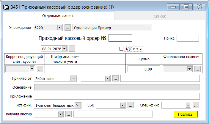 Форма применяется для оформления поступления денег в кассу как при ручной, так и при автоматизированной обработке учетно-отчетной документации. Выписывается в одном экземпляре работником бухгалтерии. Квитанция выдается на руки сдавшему деньги, а ордер остается в кассе. Подписывается приходный кассовый ордер главным бухгалтером или уполномоченным на это лицом.