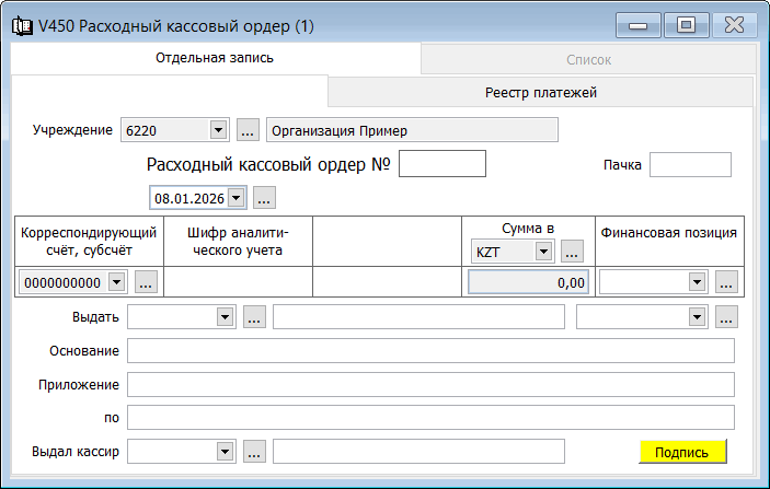 | Расходный кассовый ордер № | Номер расходного кассового ордера. Должен быть уникальным для предприятия в течении года | 11 знаков | ||||