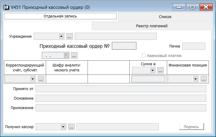 Форма применяется для оформления поступления денег в кассу как при ручной, так и при автоматизированной обработке учетно-отчетной документации. Выписывается в одном экземпляре работником бухгалтерии. Квитанция выдается на руки сдавшему деньги, а ордер остается в кассе. Подписывается приходный кассовый ордер главным бухгалтером или уполномоченным на это лицом.