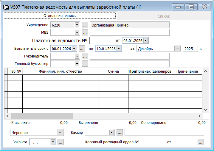 | Платежная ведомость № | Указать номер платежной ведомости | 4 знака | ||||