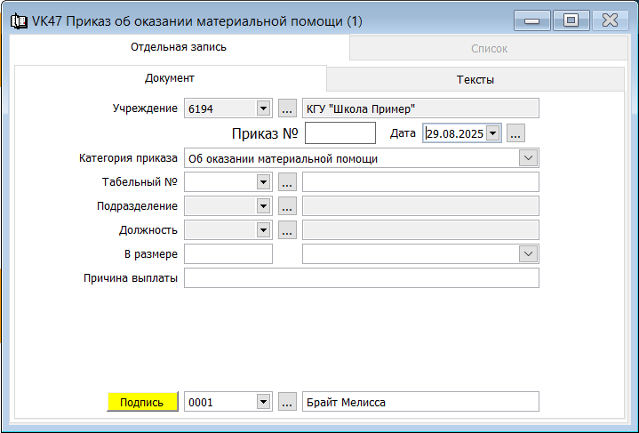 С помощью этого документа оформляется оказание материальной помощи работнику. Документ имеет несколько вкладок. На вкладке Документ содержится общая информация о приказе.