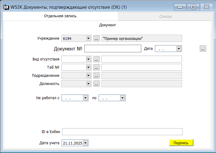 Окно используется для ввода в систему документов изданных вне предприятия для учёта времени отсутствия работника на рабочем месте (повестки, справки и т.д.).