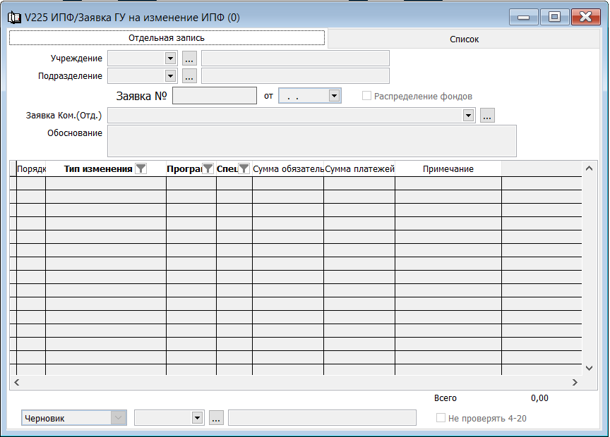 В Заявке ГУ об изменение ИПФ не активны кнопки "Изменить", "Удалить". Почему не могу сделать изменение в документе? Это значит, что Заявка ГУ об изменение ИПФ уже проверена и подписана вашим АБП. Его можно увидеть в самом документе, в правом нижнем углу - изменен сатус на "Проверено АБП". С данным статусом документ не редактируется. |